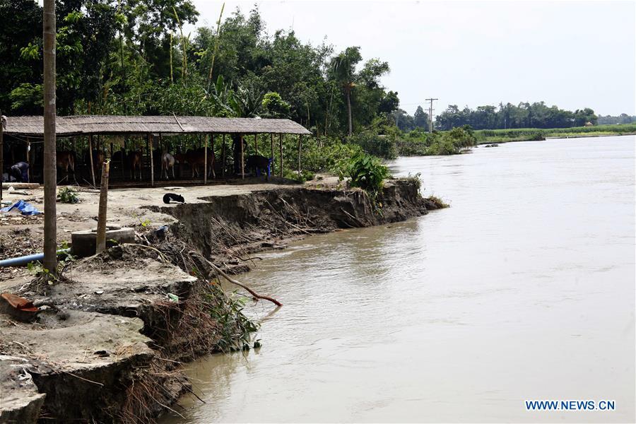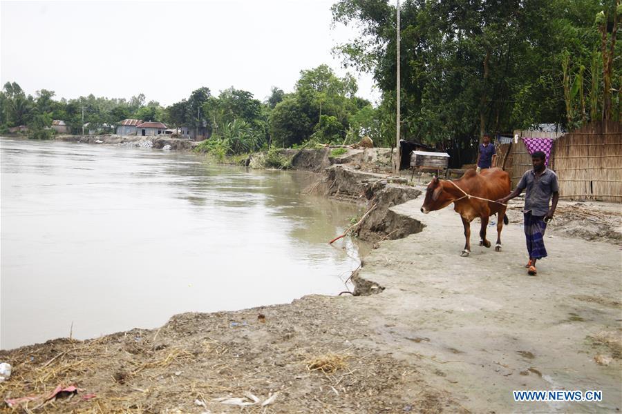 Photo taken on July 9, 2020 shows the eroded bank of a river in Manikganj district, some 63 km northwest of capital Dhaka, Bangladesh. Flooding caused by heavy rains and the onrush of water from hills have seriously affected the villagers here. (Xinhua)