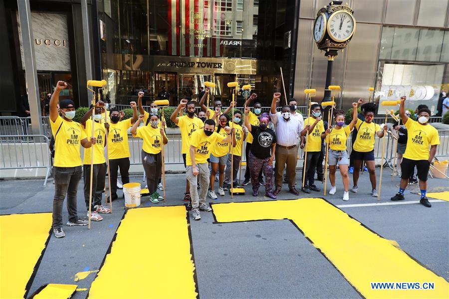 People who paint "Black Lives Matter" mural pose for a photo in front of Trump Tower in New York, the United States, on July 9, 2020. A giant, yellow "Black Lives Matter" mural was painted Thursday on New York City's Fifth Avenue right in front of Trump Tower, a skyscraper that serves as the headquarters for the Trump Organization. (Xinhua/Wang Ying)