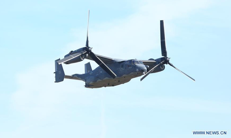 A CV-22 Osprey aircraft of the United States Air Force performs at the International Sanicole Airshow in Hechtel, Belgium, Sept. 15, 2019.Photo:Xinhua