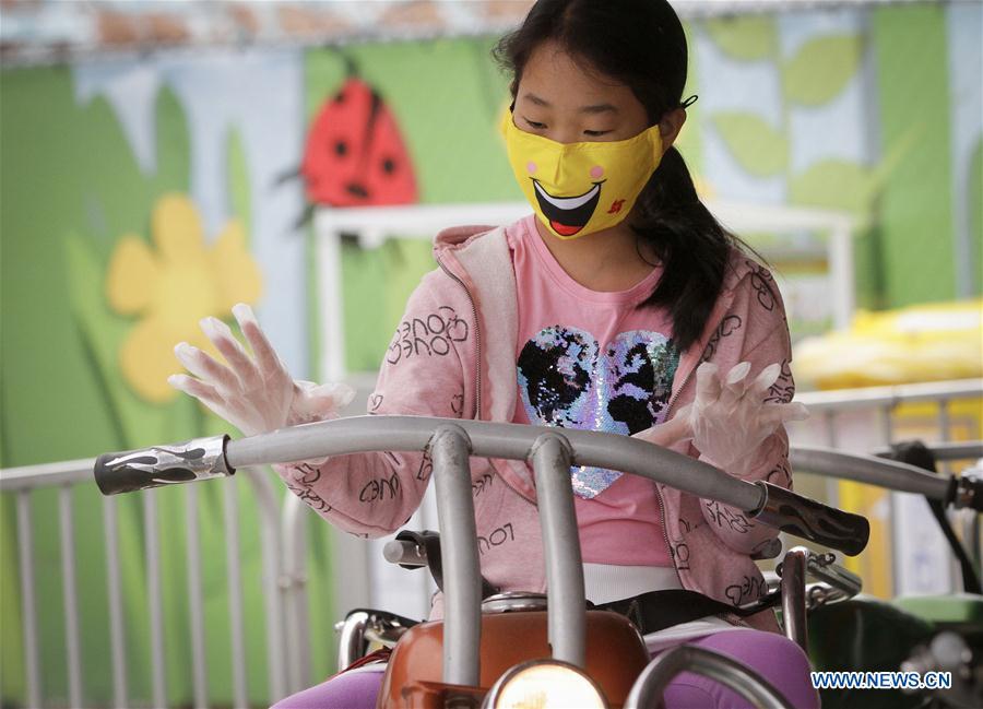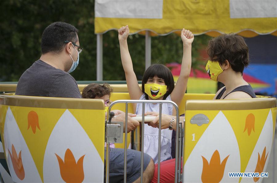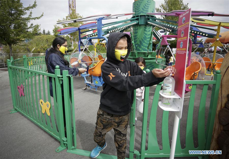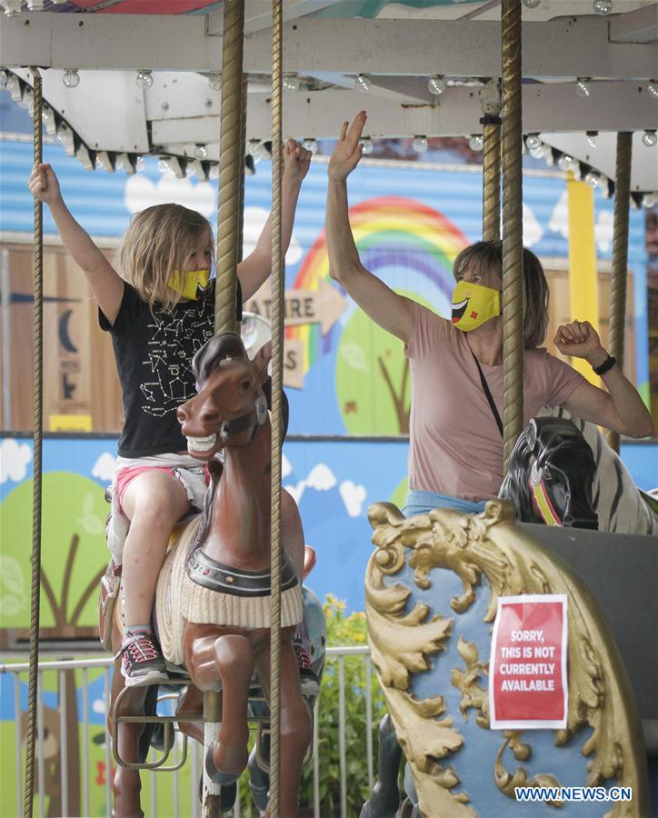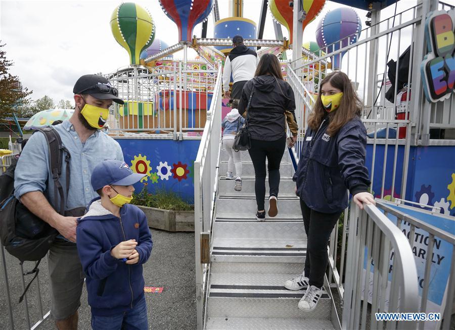 People wearing face masks enjoy themselves in Playland Amusement Park at Pacific National Exhibition in Vancouver, British Columbia, Canada, on July 10, 2020. Playland Amusement Park was reopened to public on Friday, with measures to ensure proper health and safety protocols throughout the park. (Photo by Liang Sen/Xinhua)