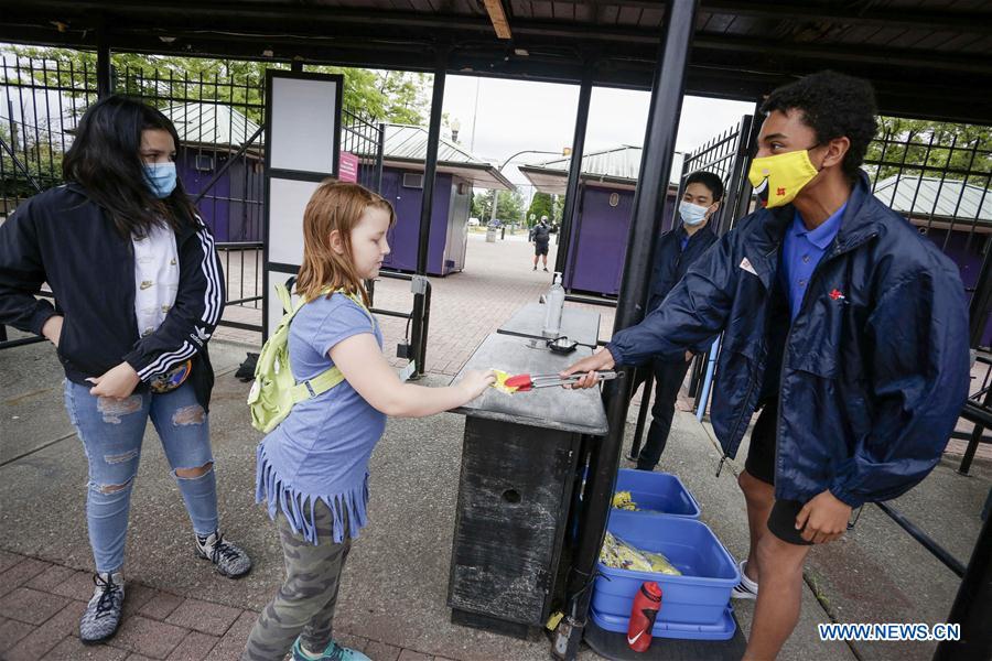 People prepare to take a ride in Playland Amusement Park at Pacific National Exhibition in Vancouver, British Columbia, Canada, on July 10, 2020. Playland Amusement Park was reopened to public on Friday, with measures to ensure proper health and safety protocols throughout the park. (Photo by Liang Sen/Xinhua)