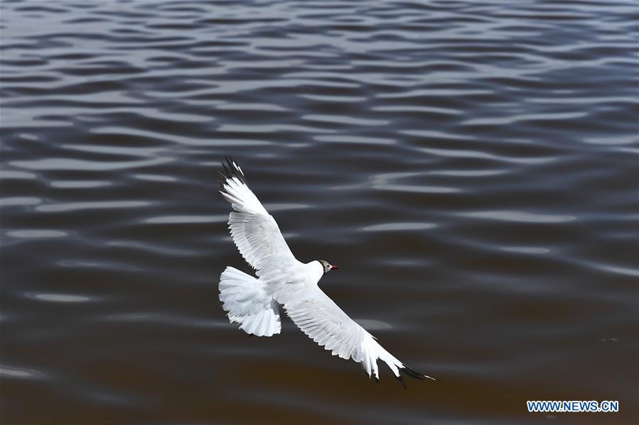 A brown-headed gull flies over the Qinghai Lake in northwest China's Qinghai Province, July 10, 2020. (Xinhua/Zhang Hongxiang)