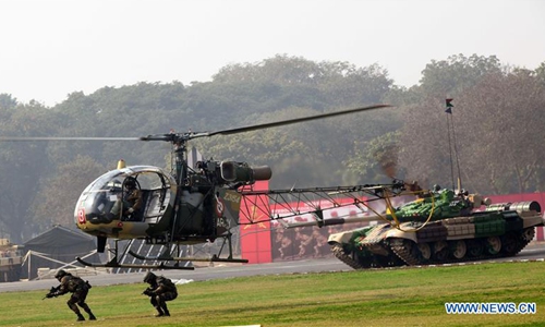Indian army soldiers take part in a battle demonstration during the Army Day Parade in New Delhi, India, Jan. 15, 2020. Photo:Xinhua
