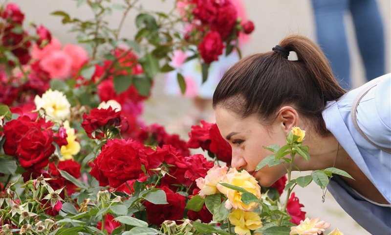 A women smells the flowers at a botanical garden in Minsk, Belarus, July 11, 2020. (Photo by Henadz Zhinkov/Xinhua)