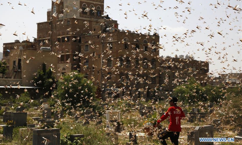 A boy walks through a swarm of desert locusts in Sanaa, Yemen, July 12, 2020. The United Nations Food and Agriculture Organization (FAO) has said that the desert locust threat in Africa is one of the biggest challenges facing the world's food systems, already creating devastating impacts in East Africa and Yemen. According to FAO, a small swarm of the pests can in one day eat crops that could have otherwise fed 35,000 people. (Photo by Mohammed Mohammed/Xinhua)