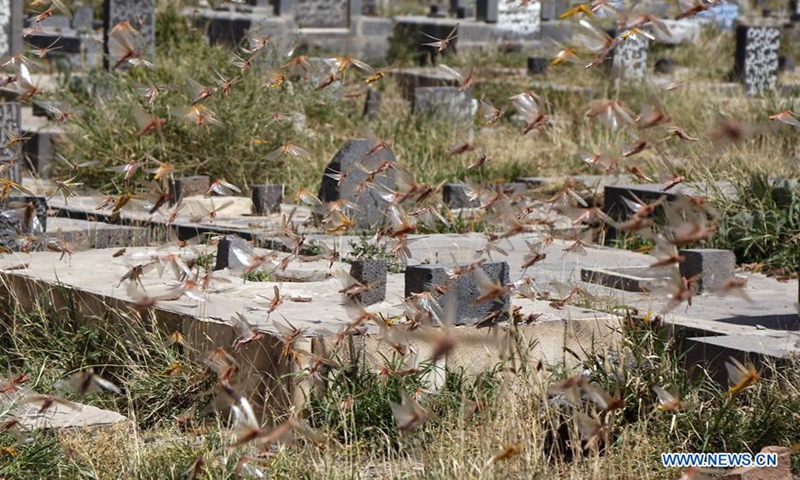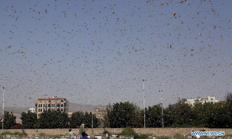 A swarm of desert locusts fly toward the ground in Sanaa, Yemen, July 12, 2020. The United Nations Food and Agriculture Organization (FAO) has said that the desert locust threat in Africa is one of the biggest challenges facing the world's food systems, already creating devastating impacts in East Africa and Yemen. According to FAO, a small swarm of the pests can in one day eat crops that could have otherwise fed 35,000 people. (Photo by Mohammed Mohammed/Xinhua)