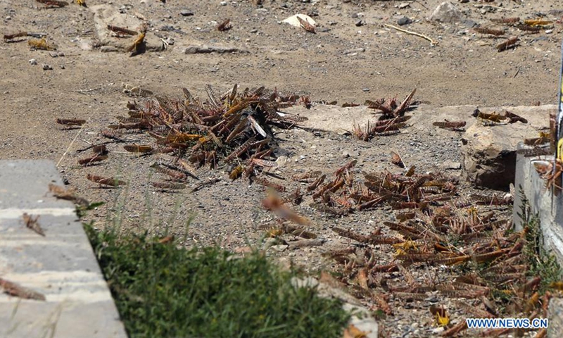 Desert locusts are seen on the ground in Sanaa, Yemen, July 12, 2020. The United Nations Food and Agriculture Organization (FAO) has said that the desert locust threat in Africa is one of the biggest challenges facing the world's food systems, already creating devastating impacts in East Africa and Yemen. According to FAO, a small swarm of the pests can in one day eat crops that could have otherwise fed 35,000 people. (Photo by Mohammed Mohammed/Xinhua)