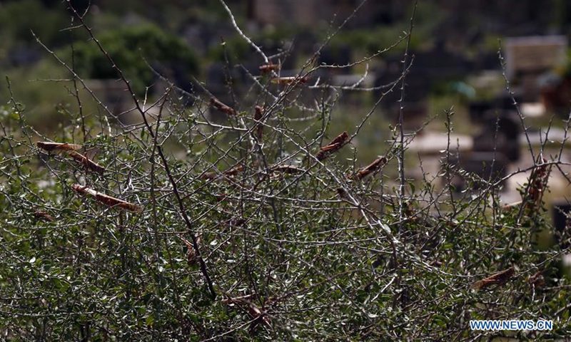 Desert locusts stay on a plant in Sanaa, Yemen, July 12, 2020. The United Nations Food and Agriculture Organization (FAO) has said that the desert locust threat in Africa is one of the biggest challenges facing the world's food systems, already creating devastating impacts in East Africa and Yemen. According to FAO, a small swarm of the pests can in one day eat crops that could have otherwise fed 35,000 people. (Photo by Mohammed Mohammed/Xinhua)
