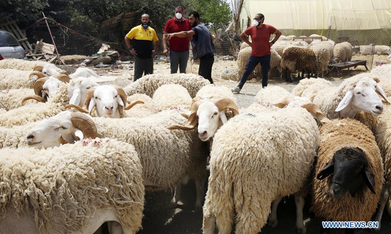 People are seen at a stall selling living sheep ahead of Eid al-Adha in Algiers, Algeria, on July 12, 2020. (Xinhua)