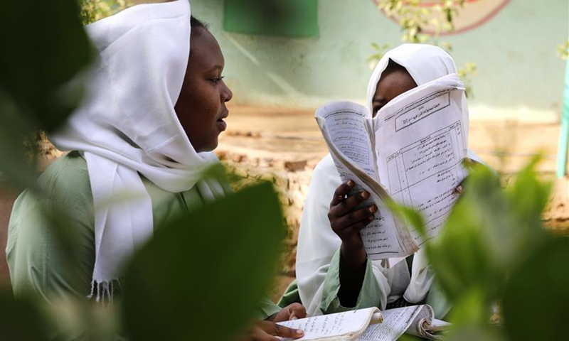 Two students conduct group revision before entering the hall for Basic School Certificate Examinations in Khartoum, Sudan, July 12, 2020. (Xinhua/Mohamed Khidir)
