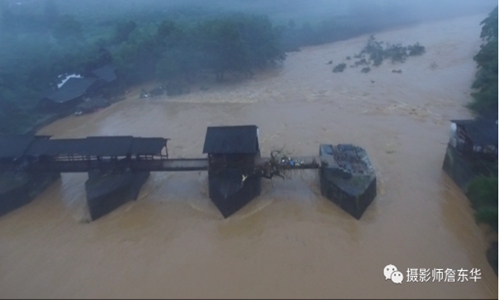 Rainbow Bridge in East China's Jiangxi Province was damaged by flood on Wednesday Photo: Snapshot of Jiangxi Wuyuan Tourism Company's official WeChat account