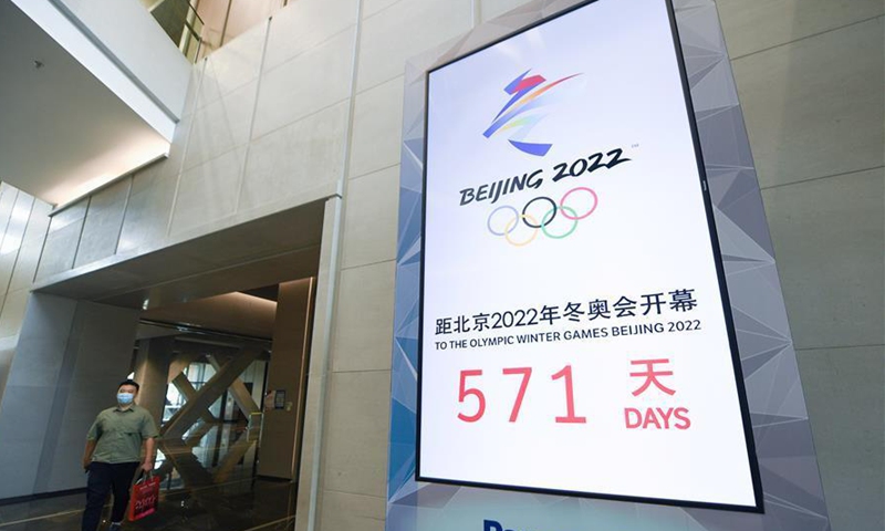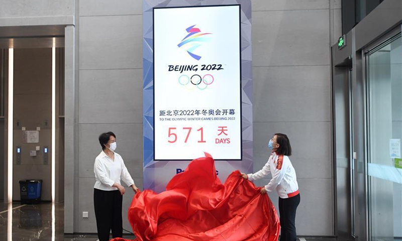 Photo taken on July 13, 2020 shows the countdown device of the Olympic Winter Games Beijing 2022 in a building of the Beijing Organizing Committee for the 2022 Winter Olympics at Shougang's old industrial park in Beijing, capital of China. The countdown device was unveiled on Monday. (Xinhua/Ju Huanzong)