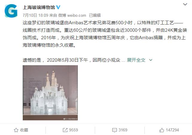 Shanghai Museum of Glass posts an announcement on Sina Weibo, saying a glass castle worth about 420,000 yuan ($60,000) is damaged by two children while they are chasing each other. Photo: Screenshot of the post of Shanghai Museum of Glass