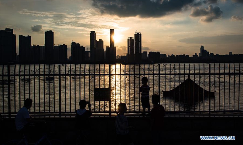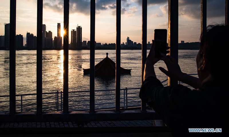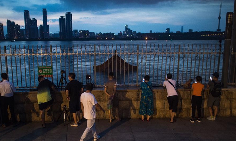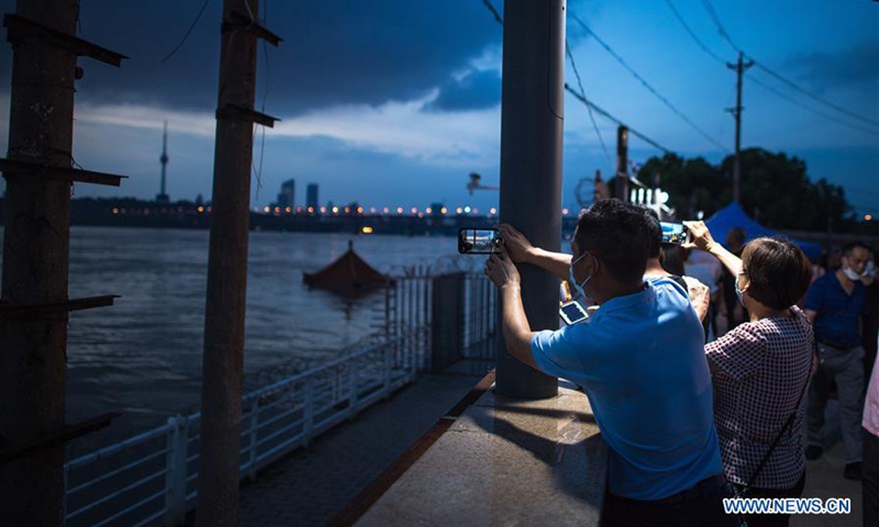 People take photos of a pavilion submerged by the Yangtze River with rising water level in Wuhan, central China's Hubei Province, July 13, 2020. The water level of Yangtze River in Hankou of Wuhan declined from the previous peak of 28.77 meters to 28.74 meters on Monday afternoon. (Xinhua/Xiao Yijiu)