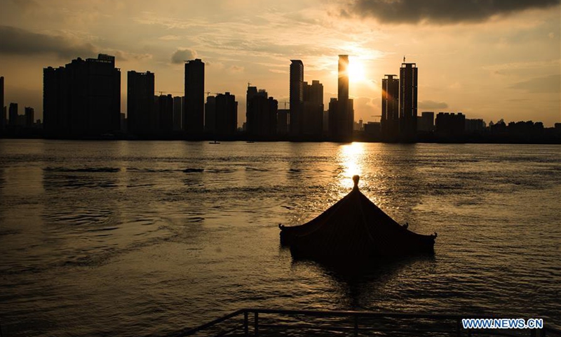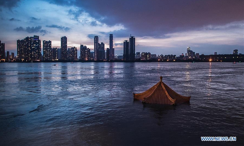 Photo taken on July 13, 2020 shows a pavilion submerged by the Yangtze River with rising water level in Wuhan, central China's Hubei Province. The water level of Yangtze River in Hankou of Wuhan declined from the previous peak of 28.77 meters to 28.74 meters on Monday afternoon. (Xinhua/Xiao Yijiu)