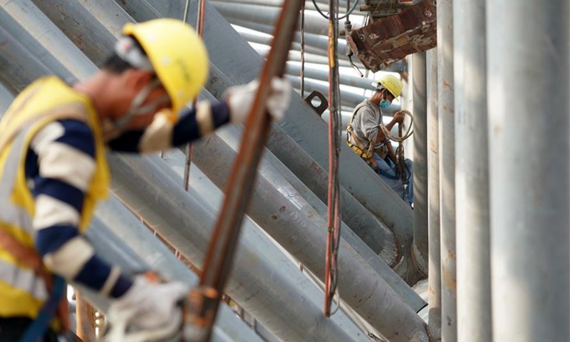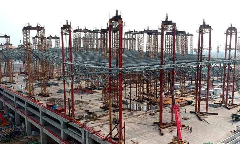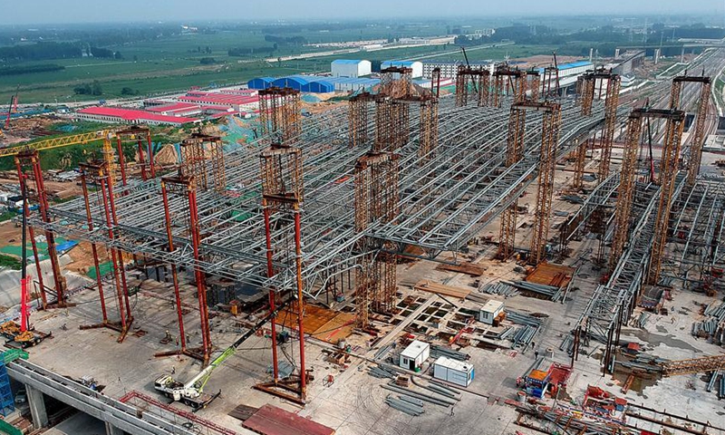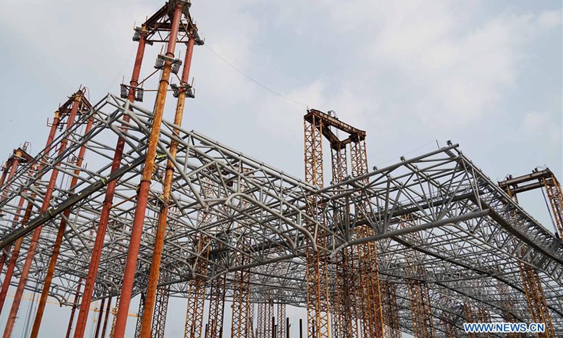 Constructors work at the construction site of Zhengzhou South Railway Station in Zhengzhou, central China's Henan Province, July 13, 2020. (Xinhua/Li An)