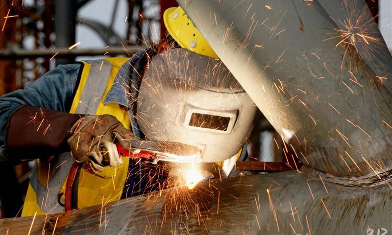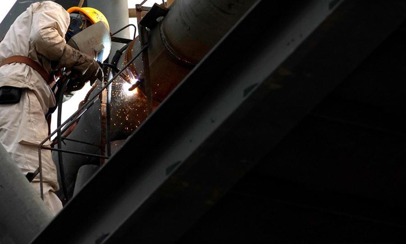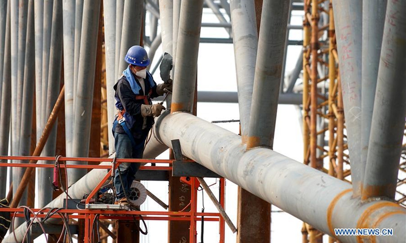 A constructor works at the construction site of Zhengzhou South Railway Station in Zhengzhou, central China's Henan Province, July 13, 2020. (Xinhua/Li An)