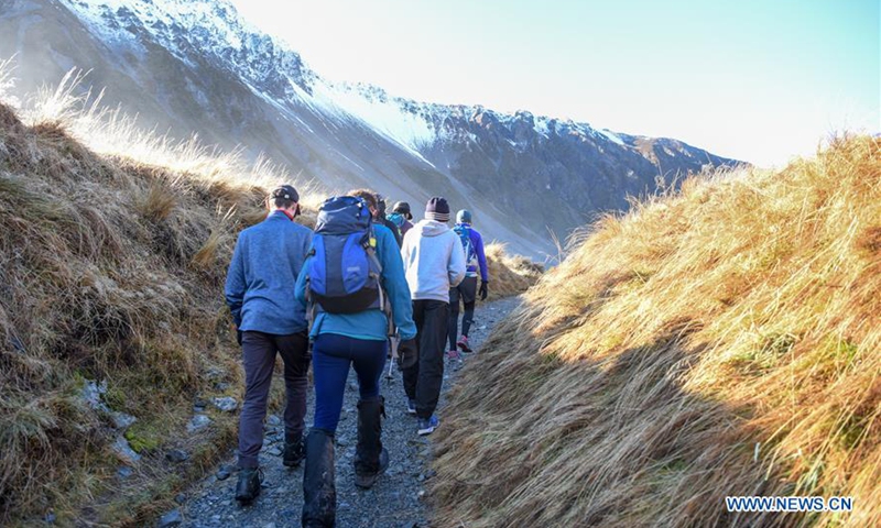 Hikers march towards New Zealand's highest mountain, Aoraki/Mount Cook, at Aoraki/Mount Cook National Park in the South Island of New Zealand, July 13, 2020. The Aoraki/Mount Cook National Park consists of 19 peaks which are at least 3,000 meters above sea level, as well as the Tasman Glacier and many glacial lakes. (Xinhua/Guo Lei)
