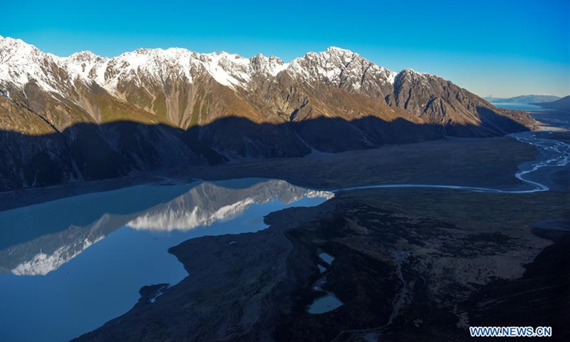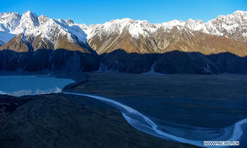 Photo taken on July 13, 2020 shows the landscape at Aoraki/Mount Cook National Park in the South Island of New Zealand. The Aoraki/Mount Cook National Park consists of 19 peaks which are at least 3000 meters above sea level, as well as the Tasman Glacier and many glacial lakes. (Xinhua/Guo Lei)