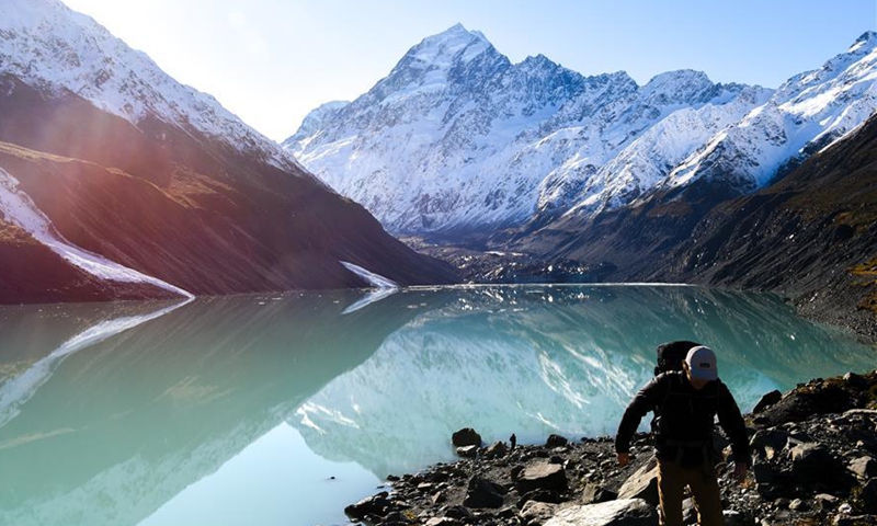 A hiker walks by Hooker Lake at Aoraki/Mount Cook National Park in the South Island of New Zealand, July 13, 2020. The Aoraki/Mount Cook National Park consists of 19 peaks which are at least 3,000 meters above sea level, as well as the Tasman Glacier and many glacial lakes. (Xinhua/Guo Lei)
