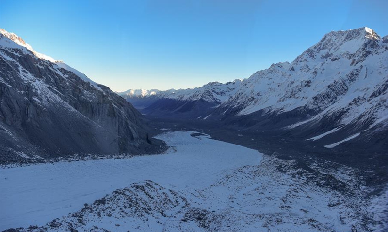 Photo taken on July 13, 2020 shows the Tasman Glacier at Aoraki/Mount Cook National Park in the South Island of New Zealand. The Aoraki/Mount Cook National Park consists of 19 peaks which are at least 3,000 meters above sea level, as well as the Tasman Glacier and many glacial lakes. (Xinhua/Guo Lei)