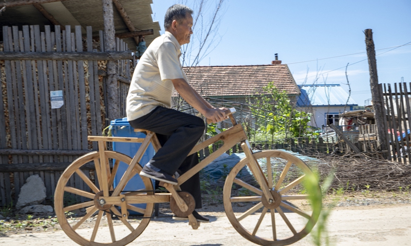 A 70-year-old farmer in Jilin, Northeast China's Jilin province, rides a bike that he made using only wood on Tuesday. Photo: IC