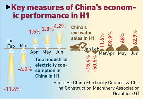 Recently released figures for power generation, raw steel output, excavator sales, railway cargo and express deliveries all pointed to active growth, prompting a report by financial news site yicai.com, which said that a positive figure for second-quarter GDP is "a large probability event."