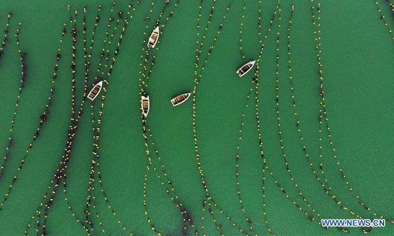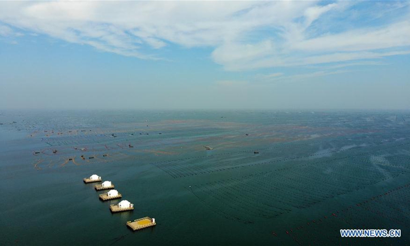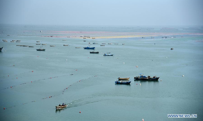 Aerial photo shows a national marine ranch in Rongcheng City, east China's Shandong Province, July 15, 2020. In summer, marine ranches in Rongcheng enter tourist season. The city in recent years has invested in marine economies, including building marine ranches, to boost tourism. (Xinhua/Wang Kai)
