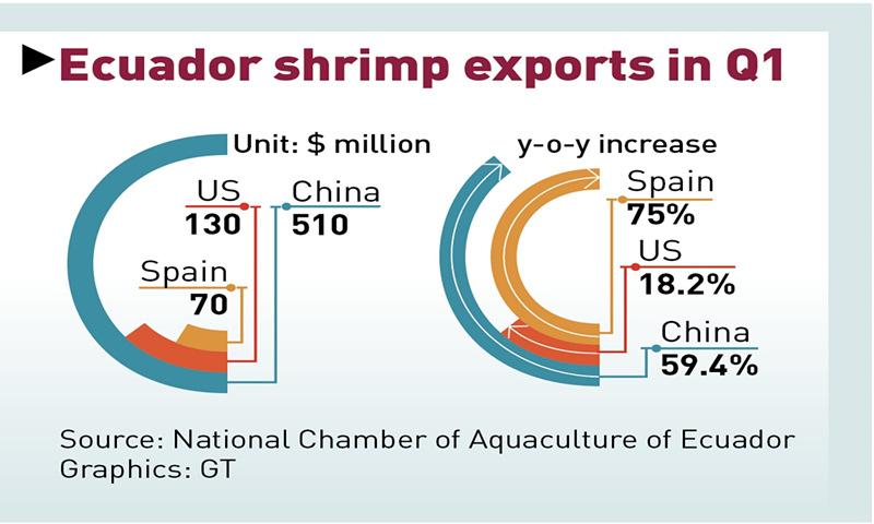 China is the biggest importer of Ecuadorian white shrimp. In April, China imported 47,000 tons of white shrimp from Ecuador, accounting for about 80 percent of Ecuador's national exports, according to National Chamber of Aquaculture of Ecuador.