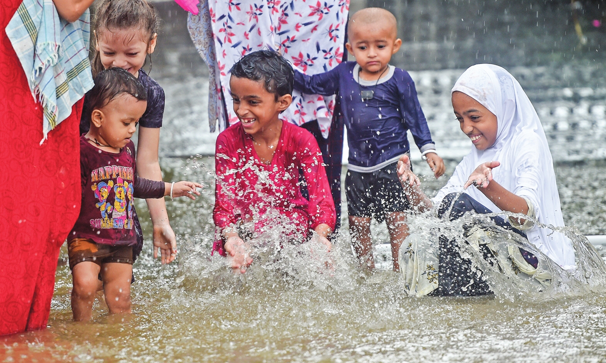 Children play in a flooded street during a rain shower in Mumbai, India on Wednesday. The monsoon season, which usually falls from June to September, is crucial to the economy of the Indian sub-continent, but also causes widespread death and destruc¬tion across the region each year. Photo: AFP