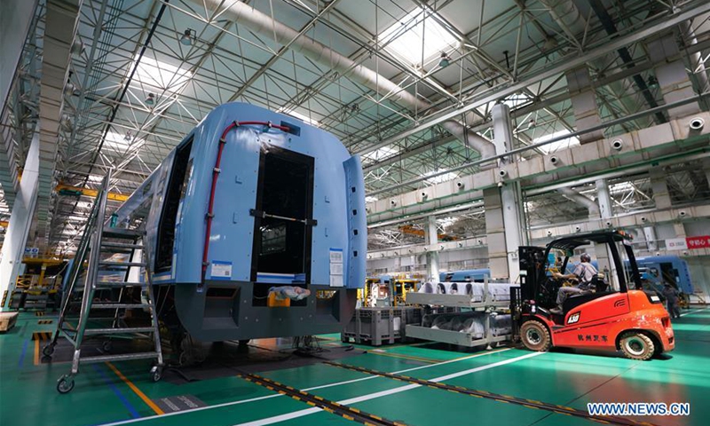 Technicians work on a high-speed trains production line of CRRC Tangshan Co., Ltd. in Tangshan City in north China's Hebei Province, July 16, 2020. The production capacity of this company has recovered from the effect of COVID-19 with the help of local governments to fulfil the orders from home and abroad. (Xinhua/Xing Guangli)
