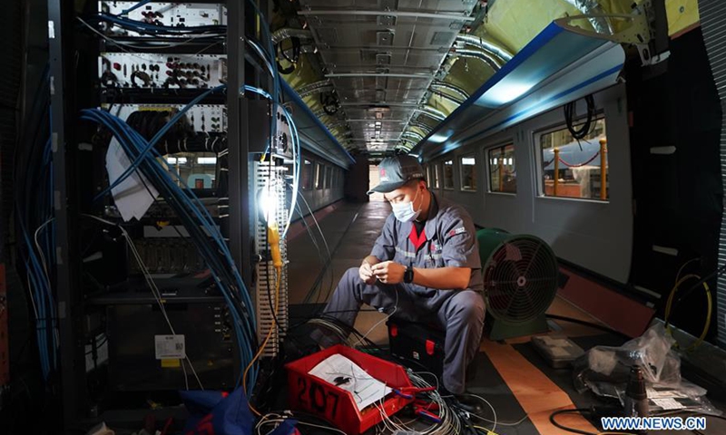 A technician works on a high-speed trains production line of CRRC Tangshan Co., Ltd. in Tangshan City in north China's Hebei Province, July 16, 2020. The production capacity of this company has recovered from the effect of COVID-19 with the help of local governments to fulfil the orders from home and abroad. (Xinhua/Xing Guangli)