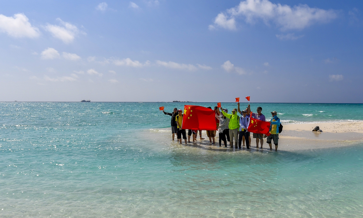 Visitors pose for a group photo with China's national flag at the Xisha Islands on May 21, 2019. Photo: cnsphoto