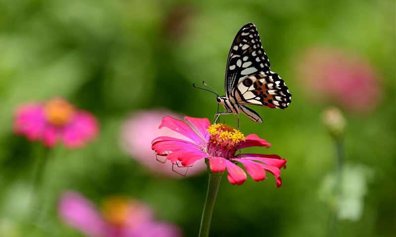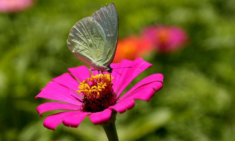 A butterfly collects pollen from a flower on the outskirts of Yangon, Myanmar, July 16, 2020.Photo:Xinhua