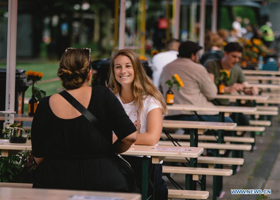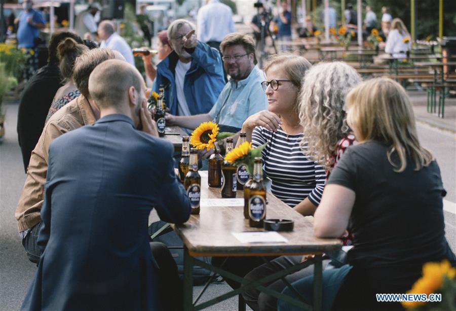 People enjoy themselves at a beer garden on Vogelsanger street in Cologne, Germany, July 17, 2020. The beer garden, which is approved and supported by local authorities, opened on Friday with COVID-19 control and prevention measures. (Photo by Tang Ying/Xinhua)