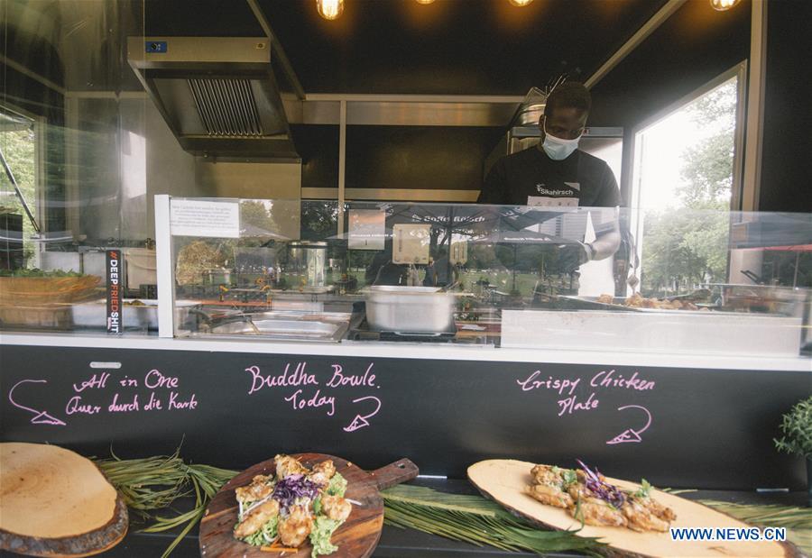 A staff member prepares food for customers at a beer garden on Vogelsanger street in Cologne, Germany, July 17, 2020. The beer garden, which is approved and supported by local authorities, opened on Friday with COVID-19 control and prevention measures. (Photo by Tang Ying/Xinhua)