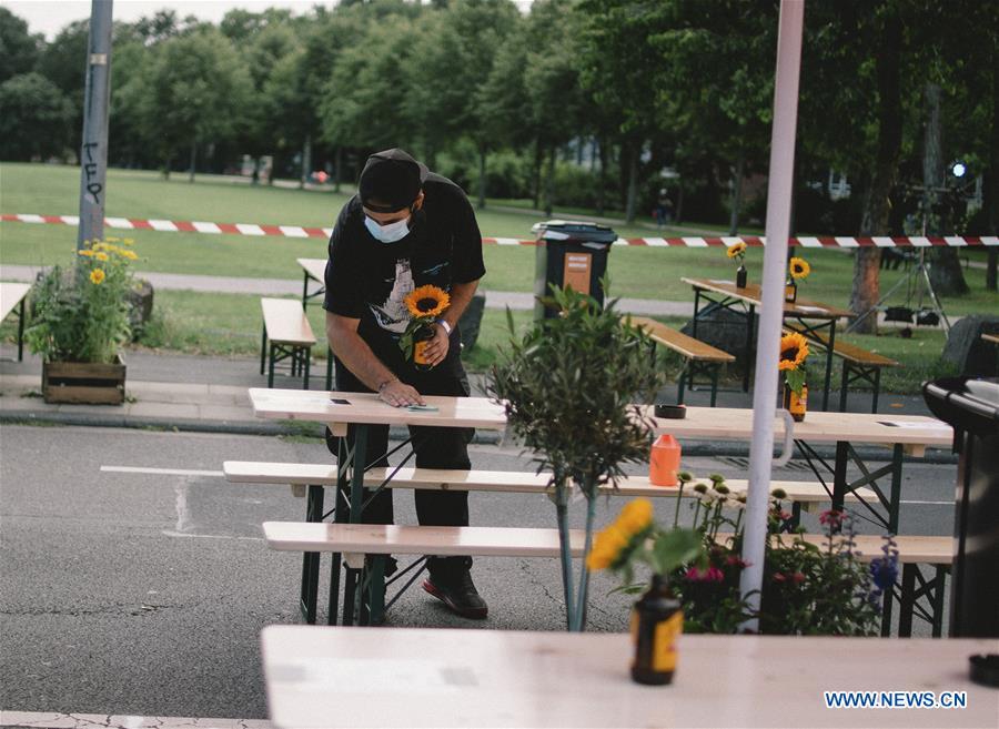 A staff member cleans a table at a beer garden on Vogelsanger street in Cologne, Germany, July 17, 2020. The beer garden, which is approved and supported by local authorities, opened on Friday with COVID-19 control and prevention measures. (Photo by Tang Ying/Xinhua)