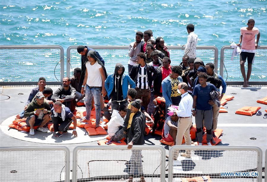 Migrants arrive at the Boiler Wharf in Senglea, Malta, on July 17, 2020. A group of 63 migrants rescued from their stalled boat which was taking in water in Malta's search and rescue zone, have arrived in Malta, local media Times of Malta reported on Friday. (Photo by Jonathan Borg/Xinhua)