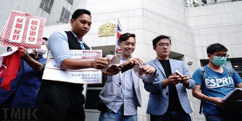 Hong Kong residents tear up BNO passports in front of the consulate to protest against UK interference over the national security law. Photo: Courtesy of Ko Chung Kit Jacky