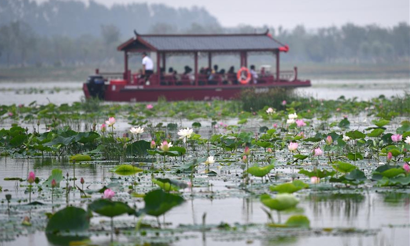 Tourists take a boat at the Shuguang Water Town in Zhaozhuangzi Village, Beichen District of Tianjin, north China, July 18, 2020. The first phase of Shuguang Water Town project, which covers an area of more than 5,000 mu (about 333 hectare), opened to the public on Saturday. Local authorities expect that the project will create more job opportunities for villagers and help them raise their income. (Xinhua/Li Ran)
