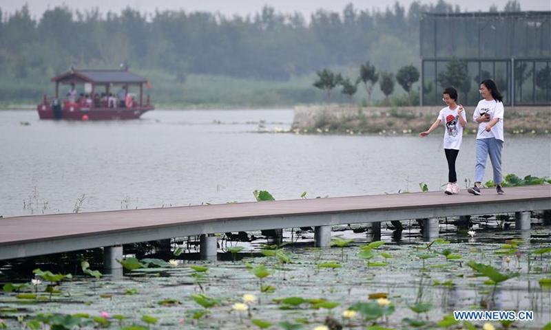 People visit the Shuguang Water Town in Zhaozhuangzi Village, Beichen District of Tianjin, north China, July 18, 2020. The first phase of Shuguang Water Town project, which covers an area of more than 5,000 mu (about 333 hectare), opened to the public on Saturday. Local authorities expect that the project will create more job opportunities for villagers and help them raise their income. (Xinhua/Li Ran)