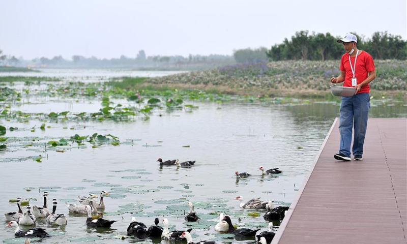 A staff member feeds waterfowls at the Shuguang Water Town in Zhaozhuangzi Village, Beichen District of Tianjin, north China, July 18, 2020. The first phase of Shuguang Water Town project, which covers an area of more than 5,000 mu (about 333 hectare), opened to the public on Saturday. Local authorities expect that the project will create more job opportunities for villagers and help them raise their income. (Xinhua/Li Ran)