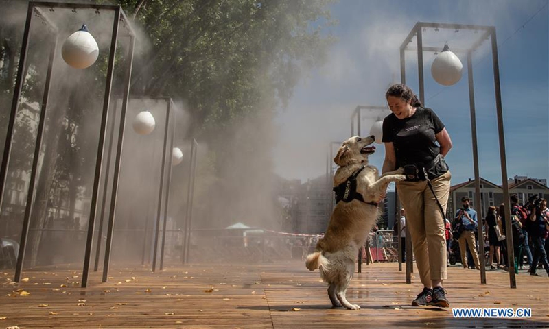 A woman and her dog cool themselves during the Paris Plages event in Paris, France, on July 18, 2020. The Paris Plages city beach event is held from July 18 to Aug. 30, offering events and activities on the banks of the Seine and the Bassin de la Villette. (Photo by Aurelien Morissard/Xinhua)