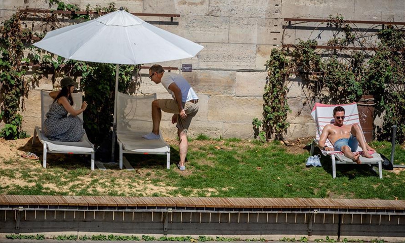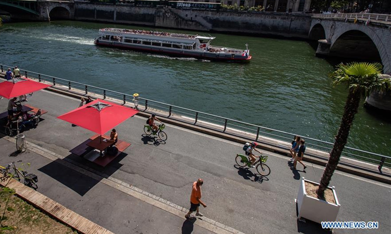 People enjoy themselves along the Seine during the Paris Plages event in Paris, France, on July 18, 2020. The Paris Plages city beach event is held from July 18 to Aug. 30, offering events and activities on the banks of the Seine and the Bassin de la Villette. (Photo by Aurelien Morissard/Xinhua)