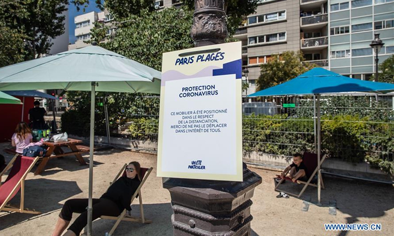 A notice of sanitary measures is seen during the Paris Plages event in Paris, France, on July 18, 2020. The Paris Plages city beach event is held from July 18 to Aug. 30, offering events and activities on the banks of the Seine and the Bassin de la Villette. (Photo by Aurelien Morissard/Xinhua)