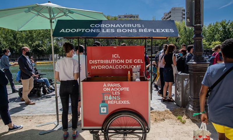 Sanitizers are seen at the Bassin de la Villette during the Paris Plages event in Paris, France, on July 18, 2020. The Paris Plages city beach event is held from July 18 to Aug. 30, offering events and activities on the banks of the Seine and the Bassin de la Villette. (Photo by Aurelien Morissard/Xinhua)
