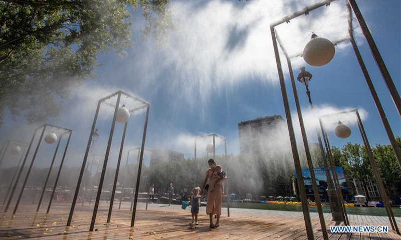 People cool themselves during the Paris Plages event in Paris, France, on July 18, 2020. The Paris Plages city beach event is held from July 18 to Aug. 30, offering events and activities on the banks of the Seine and the Bassin de la Villette. (Photo by Aurelien Morissard/Xinhua)