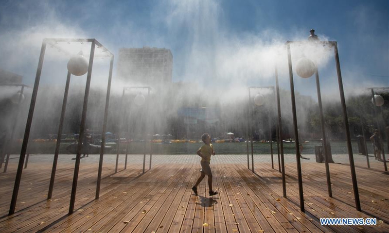 A boy cools himself during the Paris Plages event in Paris, France, on July 18, 2020. The Paris Plages city beach event is held from July 18 to Aug. 30, offering events and activities on the banks of the Seine and the Bassin de la Villette. (Photo by Aurelien Morissard/Xinhua)