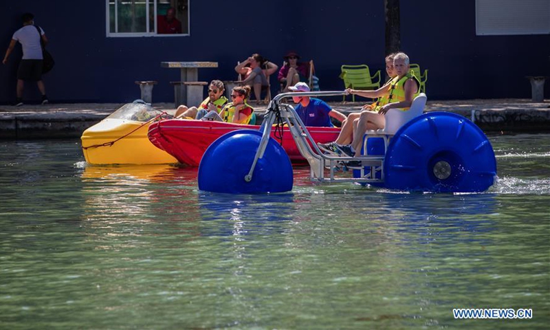 People ride pedal boats on the Bassin de la Villette during the Paris Plages event in Paris, France, on July 18, 2020. The Paris Plages city beach event is held from July 18 to Aug. 30, offering events and activities on the banks of the Seine and the Bassin de la Villette. (Photo by Aurelien Morissard/Xinhua)