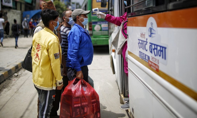A staff member measures the temperature of passengers who are about to board a bus in Kathmandu, Nepal, July 16, 2020. (Photo by Sulav Shrestha/Xinhua)